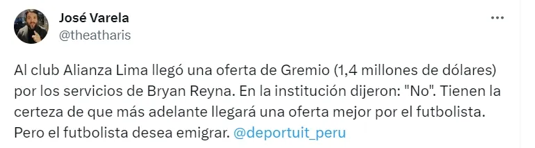 “En la institución dijeron: ‘No’. Tienen la certeza de que más adelante llegará una oferta mejor por el futbolista. Pero el futbolista desea emigrar”, comentó José Varela en su cuenta de Twitter.