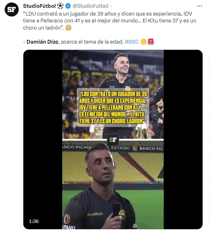 Si bien Damián Díaz no mencionó el nombre de Paolo Guerrero, sí dejó en claro que se trataba de un delantero mayor: “Liga de Quito acaba de contratar a un jugador de 39 años y dicen que trajeron ‘experiencia’, Independiente del Valle tiene a Pellerano con 41 años y es el mejor del mundo. ‘Kitu’ tiene 37 años y es un ladrón, pero bueno estoy acostumbrado”, declaró.