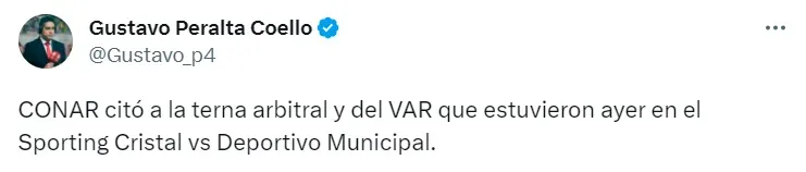 “CONAR citó a la terna arbitral y del VAR que estuvieron ayer en el Sporting Cristal vs Deportivo Municipal”, escribió el comunicador a través de su cuenta oficial de Twitter.
