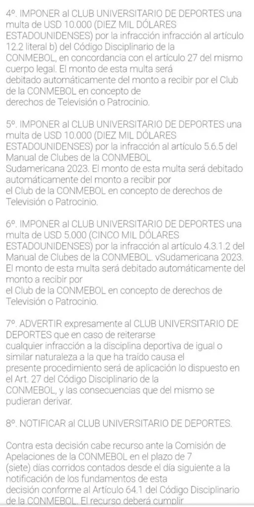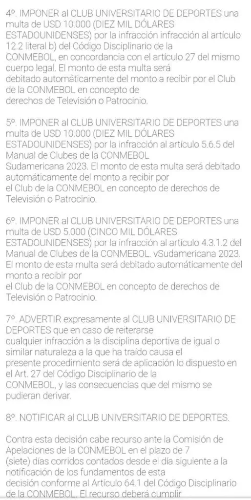 Es que según el ente deportivo encargado de nuestro continente (sudamérica), los cremas son sancionados económicamente por haber incumplido con diferentes artículos del Código Disciplinario, donde se resalta el mal comportamiento, la falta de garantía en el orden del estadio, invasión al terreno de juego y lanzamiento de objetos desde las tribunas.