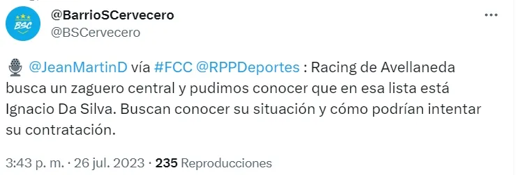 “Racing de Avellaneda busca un zaguero central y pudimos conocer que en esta lista está Ignácio Da Silva”, comentó el hombre de prensa.