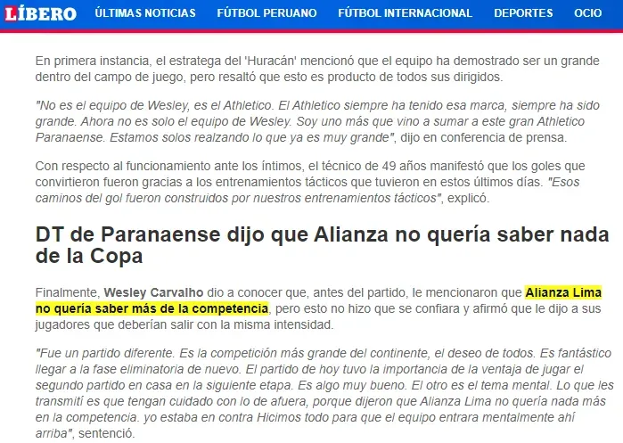 Por último, Wesley reveló que antes del encuentro, le habían comentado que los íntimos no querían saber más de la competencia internacional, pero que esto no hizo que se confiara y pidió a su plantel que salgan con la misma intensidad de siempre.