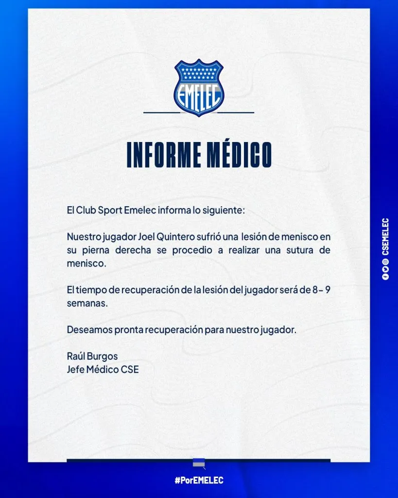 “Nuestro jugador Joel Quintero sufrió una lesión de menisco en su pierna derecha y se procedió a realizar una sutura de menisco. El tiempo de recuperación de la lesión del jugador será de 8-9 semanas”, escribieron los bombillos en sus cuentas oficiales.