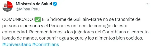 “El Síndrome de Guillain-Barré no se transmite de persona a persona y el Perú no es un foco de contagio de esta enfermedad. Recomendamos a los jugadores del Corinthians el correcto lavado de manos, consumir agua segura y los alimentos bien cocidos”, publicaron