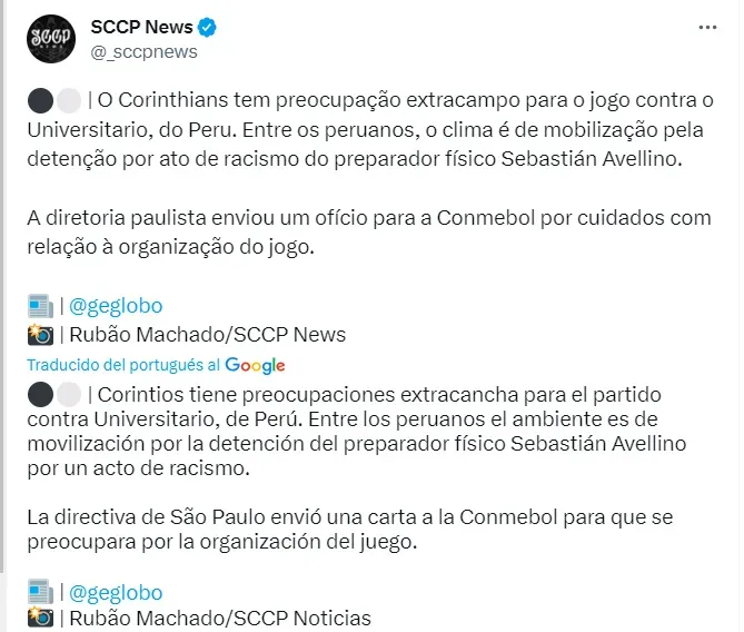 “Corinthians tiene preocupaciones extra cancha para el partido contra Universitario, de Perú. Entre los peruanos el ambiente es de movilización por la detención del preparador físico Sebastián Avellino por un acto de racismo. La directiva de São Paulo envió una carta a la Conmebol para que se preocupara por la organización del juego”, escribió la cuenta oficial del club brasileño.