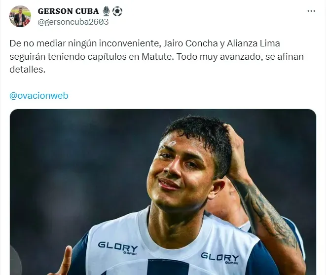 “De no mediar ningún inconveniente, Jairo Concha y Alianza Lima seguirán teniendo capítulos en Matute. Todo muy avanzado, se afinan detalles.”, compartió el comunicador en su cuenta oficial de redes sociales.