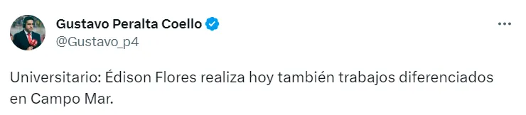 “Universitario: Édison Flores realiza hoy también trabajos diferenciados en Campo Mar”, así informó el periodista deportivo Gustavo Peralta en su cuenta oficial de Twitter.