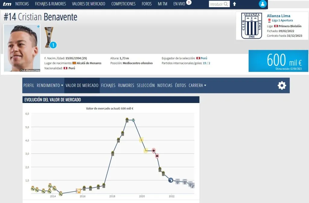 Cristian Benavente ya no es el jugador más caro de Alianza Lima. Llegando en la temporada 2022 de la Liga 1, el ‘Chaval’ fue contratado cuando costaba más de un millón de euros, pero ahora su valor bajo y en Transfermarkt solo llega a las seis cifras.