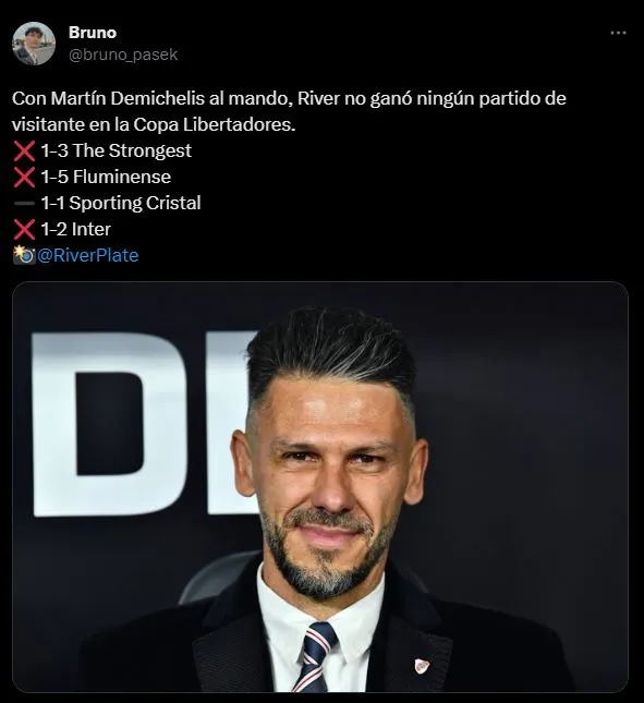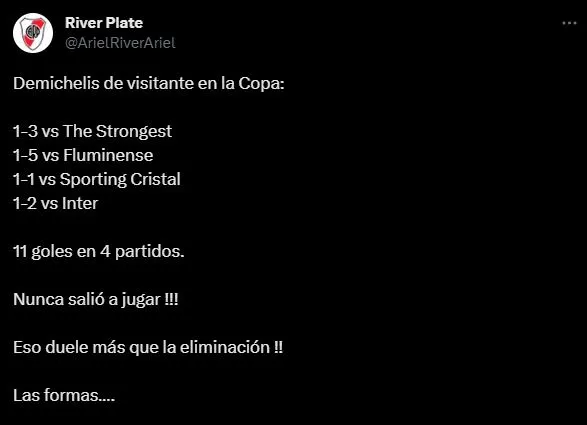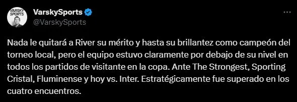 “Nada le quitará a River su mérito y hasta su brillantez como campeón del torneo local, pero el equipo estuvo claramente por debajo de su nivel en todos los partidos de visitante en la copa. Ante The Strongest, Sporting Cristal, Fluminense y hoy vs. Inter. Estratégicamente, fue superado en los cuatro encuentros”. Una crítica inteligente por parte del popular periodista deportivo.