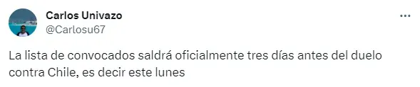 Carlos Univazo, un periodista deportivo, compartió esta noticia a través de su cuenta de Twitter, confirmando la fecha de revelación de la convocatoria oficial. “La lista de convocados saldrá oficialmente tres días antes del duelo contra Chile, es decir, este lunes”.