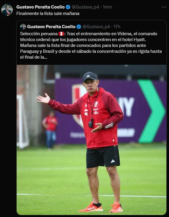 Quien en su cuenta de Twitter había anunciado ayer (miércoles 30 de agosto) lo siguiente: “Tras el entrenamiento en Videna, el comando técnico ordenó que los jugadores concentren en el hotel Hyatt. Mañana sale la lista final de convocados para los partidos ante Paraguay y Brasil y desde el sábado la concentración ya es rígida hasta el final de la primera fecha doble”.