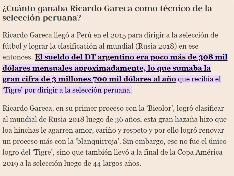 Así pues, Ricardo Gareca ganaría como mínimo 3 millones 700 mil dólares por campaña, basándonos en el sueldo que recibía con Perú.
