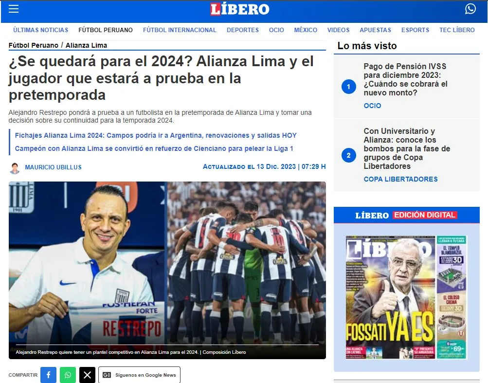 Este sería la pieza incógnita en el proyecto de Alejandro Restrepo, cuenta un diario deportivo peruano: “Líbero pudo conocer que Piero Vivanco, extremo derecho de 23 años, quien en el 2023 jugó a préstamo en Atlético Grau, será evaluado por el comando técnico de Alejandro Restrepo durante toda la pretemporada y definir si terminará quedándose en el plantel íntimo”.