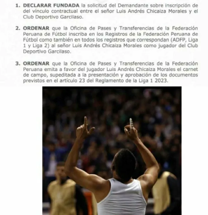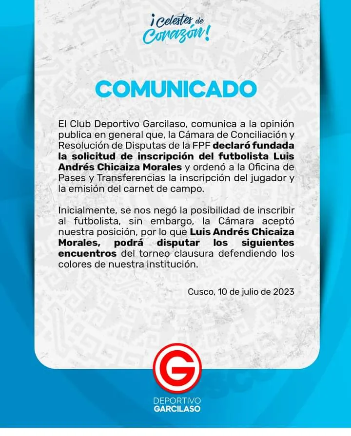“El Club Deportivo Garcilaso comunica a la opinión pública en general que la Cámara de Conciliación y Resolución de Disputas de la FPF declaró fundada la solicitud de inscripción del futbolista Luis Andrés Chicaiza Morales y ordenó a la Oficina de Pases y Transferencias la inscripción del jugador y la emisión del carnet de campo”. Explica en un comunicado el Deportivo Garcilaso.