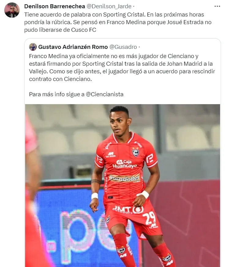 “Tiene acuerdo de palabra con Sporting Cristal. En las próximas horas pondría la rúbrica. Se pensó en Franco Medina porque Josué Estrada no pudo liberarse de Cusco FC”, comentó el hombre de prensa.