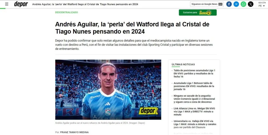Franz Tamayo, redactor de la popular página web, desarrolla la idea principal: “Se realizarán dos semanas de evaluación deportiva por ambas partes. No obstante, Sporting Cristal no es la única opción que Andrés Aguilar está considerando. El AFC Eskilstuna de Suecia también ha expresado su interés en él, principalmente debido a que Aguilar es un jugador que está siendo observado de cerca por Nolberto Solano, quien actualmente es el entrenador del equipo en la segunda división sueca”.