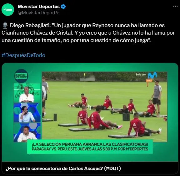 “Un jugador que Reynoso nunca ha llamado es Gianfranco Chávez de Cristal. Y yo creo que a Chávez no lo ha llamado por una cuestión de tamaño, no por una cuestión de cómo juega”, mencionó el panelista de Después de todo, en un breve análisis a la convocatoria de Carlos Ascues.