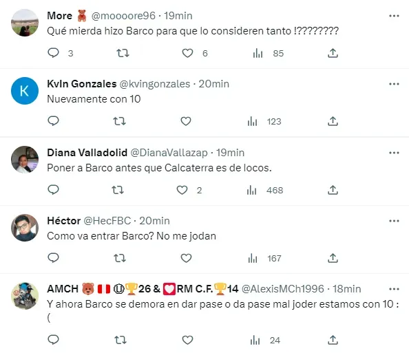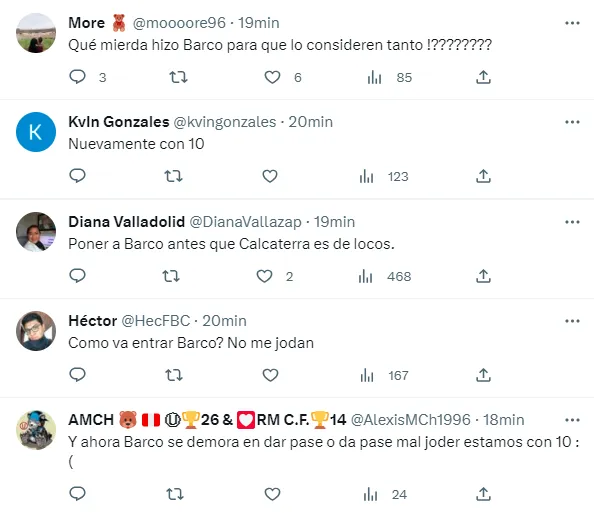 “Qué mi*** hizo Barco para que lo consideren tanto !????????”, “Poner a Barco antes que Calcaterra es de locos”, “Cómo va entrar Barco? No me jodan”, escribieron algunos seguidores.