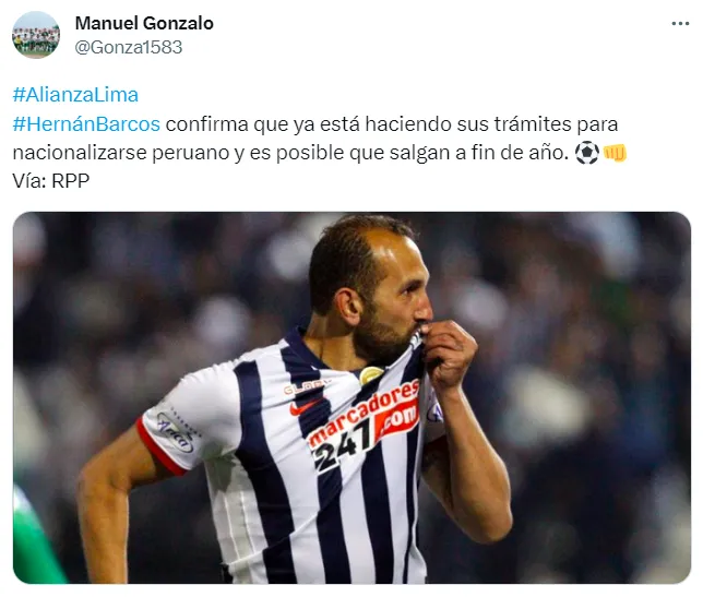 “Hernán Barcos confirma que ya está haciendo sus trámites para nacionalizarse peruano y es posible que salgan a fin de año”, citó el comunicador a través de su cuenta oficial de Twitter.
