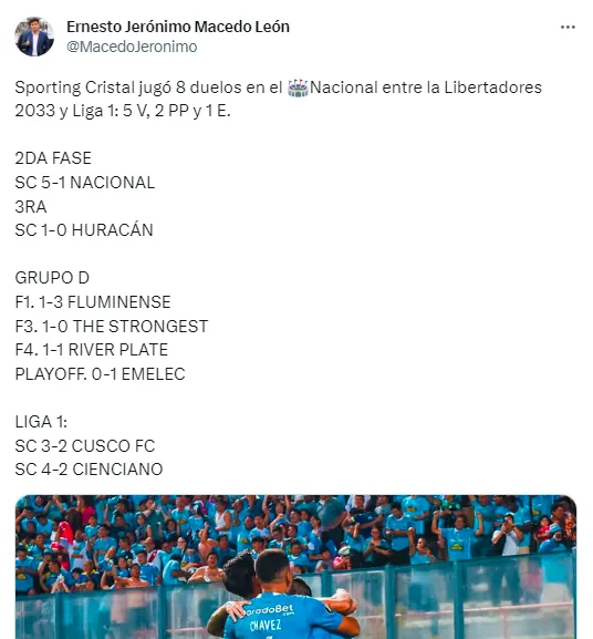 El comunicador compartió este dato en su cuenta oficial de X (anteriormente conocida como Twitter): “Sporting Cristal jugó 8 duelos en el Nacional entre la Libertadores 2033 y Liga 1: 5 victorias, 2 derrotas y 1 empate. Destacando su desempeño en la segunda fase contra Nacional (5-1) y en la tercera fase ante Huracán (1-0). En el grupo D, enfrentaron a Fluminense (1-3), The Strongest (1-0) y River Plate (1-1). En los playoffs, cayeron 0-1 ante Emelec. En la Liga 1, superaron a Cusco FC (3-2) y Cienciano (4-2)”.