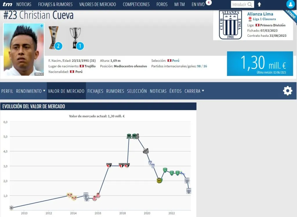 Hoy, 5 años después, y con la camiseta de Alianza Lima, el volante no ha podido prolongar el brillo y ahora está tasado en tan solo 1.30 millones de euros.