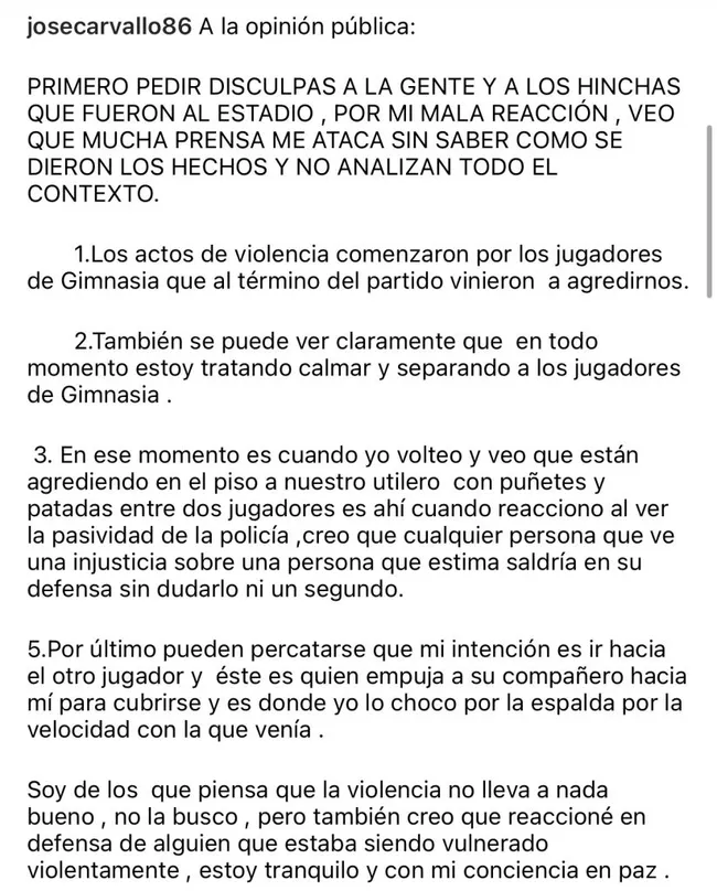 Usando sus redes sociales, José Carvallo se pronunció tras la agresión a un jugador de Gimnasia y Esgrima La Plata, durante el último encuentro de Universitario por Sudamericana.