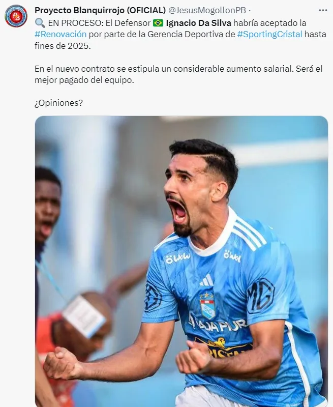 Proyecto Blanquirrojo publicó: “El defensor Ignácio Da Silva habría aceptado la renovación por parte de la gerencia deportiva de Sporting Crsital hasta fines del 2025. En el nuevo contrato se estipula un considerable aumento salarial. Será el mejor pagado del equipo”, comentó.
