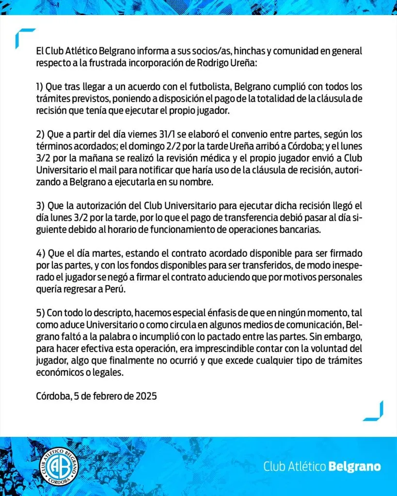 Con todo lo descrito, hacemos especial énfasis de que en ningún momento, tal como aduce Universitario o como circula en algunos medios de comunicación, Belgrano faltó a la palabra o incumplió con lo pactado entre las partes. Sin embargo, para hacer efectiva esta operación, era imprescindible contar con la voluntad del jugador, algo que finalmente no ocurrió y que excede cualquier tipo de trámites económicos o legales.