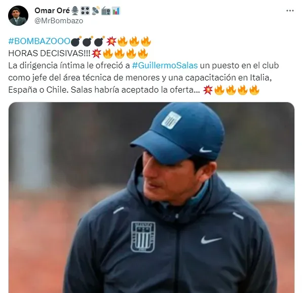 “La dirigencia íntima le ofreció a Guillermo Salas un puesto en el club como jefe del área técnica de menores y una capacitación en Italia, España o Chile. Salas habría aceptado la oferta…”, escribió el comunicador en su cuenta de twitter.