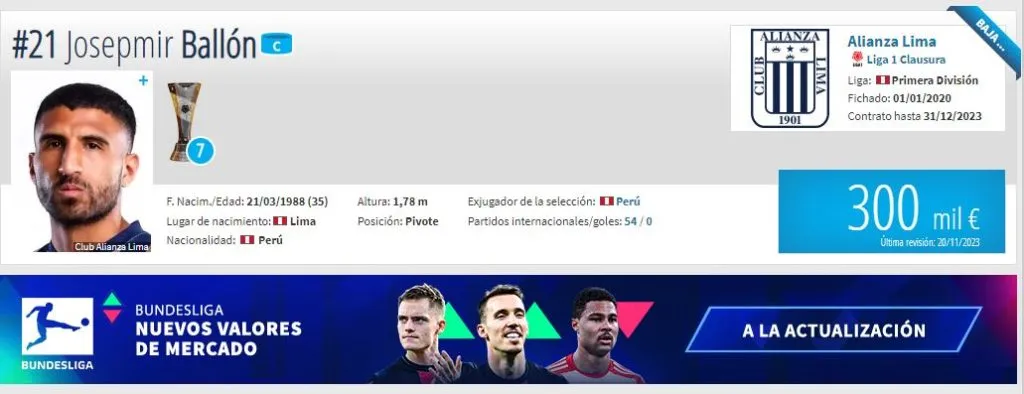 En el momento más alto de su carrera, Josepmir Ballón llegó a costar 700 mil euros en la temporada 2016, cuando jugaba en Sporting Cristal con 28 años de edad. De ahí en adelante, su carrera fue cayendo poco a poco. Hasta que llegó a Alianza Lima en 2020, proveniente del fútbol chileno, Universidad de Concepción, específicamente. Para poder darle esa cuota de jerarquía al plantel íntimo.