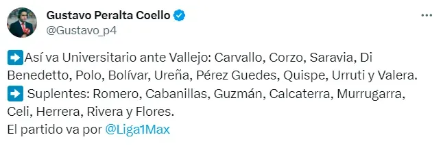 “Así va Universitario ante Vallejo: Carvallo, Corzo, Saravia, Di Benedetto, Polo, Bolívar, Ureña, Pérez Guedes, Quispe, Urruti y Valera. Suplentes: Romero, Cabanillas, Guzmán, Calcaterra, Murrugarra, Celi, Herrera, Rivera y Flores”, compartió el comunicador en su cuenta oficial de X (antes llamado Twitter).
