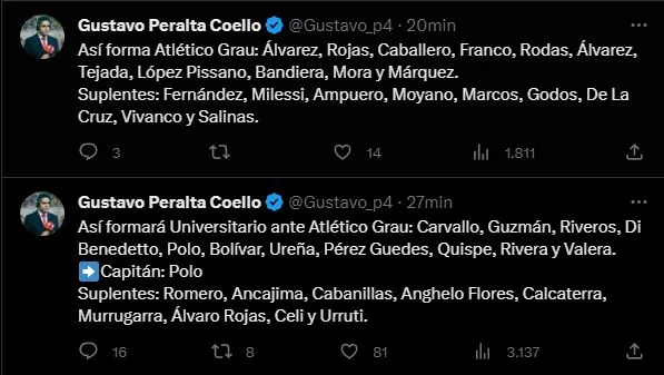 El periodista Gustavo Peralta, relató en su cuenta de Twitter, todo sobre Universitario de Deportes: “Así formará Universitario ante Atlético Grau: Carvallo, Guzmán, Riveros, Di Benedetto, Polo, Bolívar, Ureña, Pérez Guedes, Quispe, Rivera y Valera. Capitán: Polo. Suplentes: Romero, Ancajima, Cabanillas, Anghelo Flores, Calcaterra, Murrugarra, Álvaro Rojas, Celi y Urruti”.