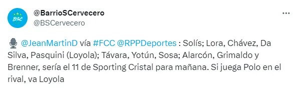 “Solís; Lora, Chávez, Da Silva, Pasquini (Loyola); Távara, Yotún, Sosa; Alarcón, Grimaldo y Brenner, sería el 11 de Sporting Cristal para mañana. Si juega Polo en el rival, va Loyola”, mencionó el peridista deportivo Jean Martin Dueñas en RPP y fue captado por BarrioSCervecero.