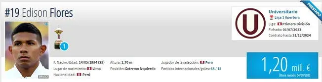 Revisando la página internacional de Transfermarkt, ahora el precio de Edison Flores se ha visto en descenso. Estando antes cerca de los dos millones de euros, su nueva cifra están en los 1.2 millones.