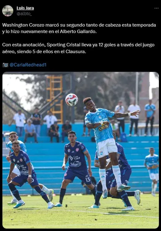 La respuesta podría precisar el periodista Luis Jara en su cuenta de Twitter: “Washington Corozo marcó su segundo tanto de cabeza esta temporada y lo hizo nuevamente en el Alberto Gallardo. Con esta anotación, Sporting Cristal lleva ya 12 goles a través del juego aéreo, siendo 5 de ellos en el Clausura. Fotografía: Carla Redhead”.