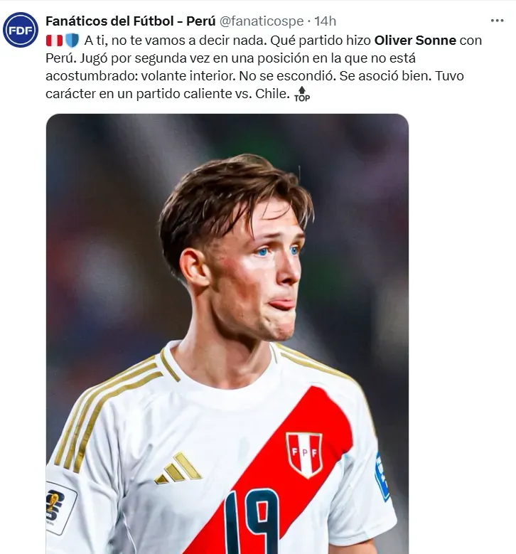 Sin duda alguna, Oliver Sonne fue uno de los mejores jugadores de Perú en su duelo ante Chile. Colocándose en la volante como interior por derecha, el futbolista recibió los elogios de la prensa y del público. Así pues, los comentarios rápidamente ganaron protagonismo y se volvieron viral.