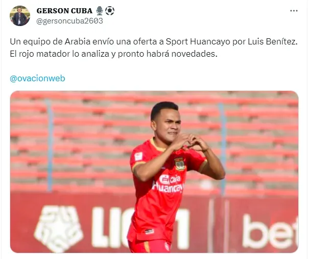 “Un equipo de Arabia envió una oferta a Sport Huancayo por Luis Benítez. El rojo matador lo analiza y pronto habrá novedades”, escribió el comunicador en su cuenta oficial de Twitter.