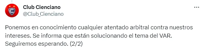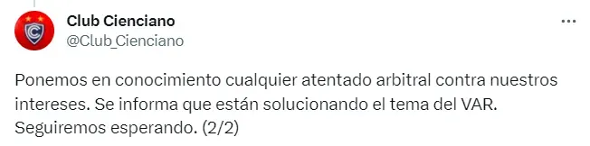 “Ponemos en conocimiento cualquier atentado arbitral contra nuestros intereses. Se informa que están solucionando el tema del VAR. Seguiremos esperando”, agregaron.