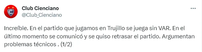 “Increíble. En el partido que jugamos en Trujillo se juega sin VAR. En el último momento se comunicó y se quiso retrasar el partido. Argumentan problemas técnicos”, indicaron en sus redes sociales.
