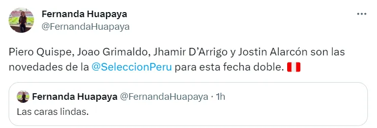 “Piero Quispe, Joao Grimaldo, Jhamir D’Arrigo y Jostin Alarcón son las novedades de la Selección Peru para esta fecha doble”, escribió la periodista deportiva Fernanda Huapaya en su cuenta oficial de Twitter.