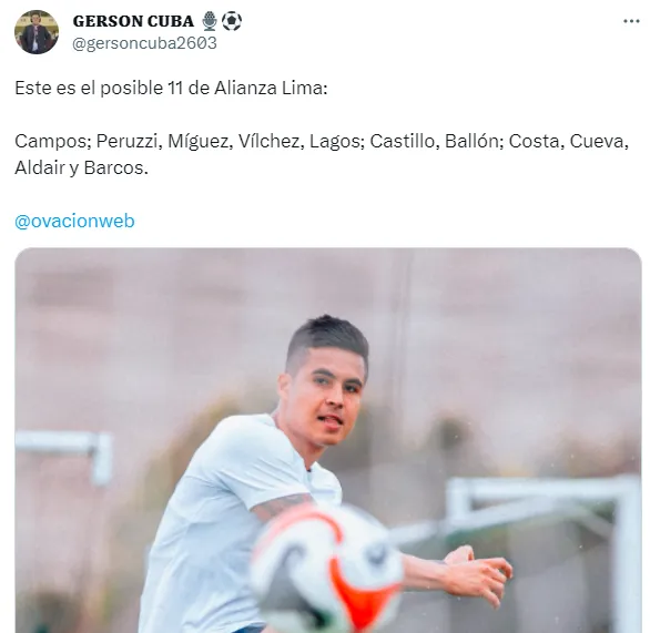 “Este es el posible 11 de Alianza Lima: Campos; Peruzzi, Míguez, Vílchez, Lagos; Castillo, Ballón; Costa, Cueva, Aldair y Barcos”, escribió el comunicador en su cuenta oficial de X (antes llamado Twitter).