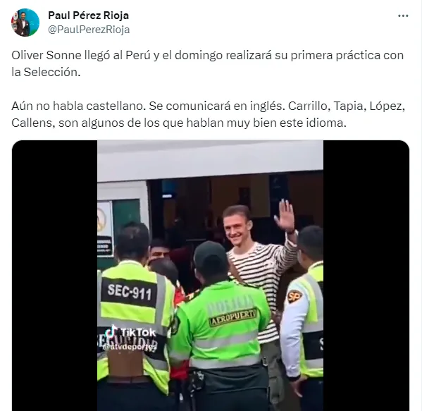 “Oliver Sonne llegó al Perú y el domingo realizará su primera práctica con la Selección. Aún no habla castellano. Se comunicará en inglés. Carrillo, Tapia, López, Callens, son algunos de los que hablan muy bien este idioma”, explicó el comunicador en su cuenta oficial de X (antes llamado Twitter).