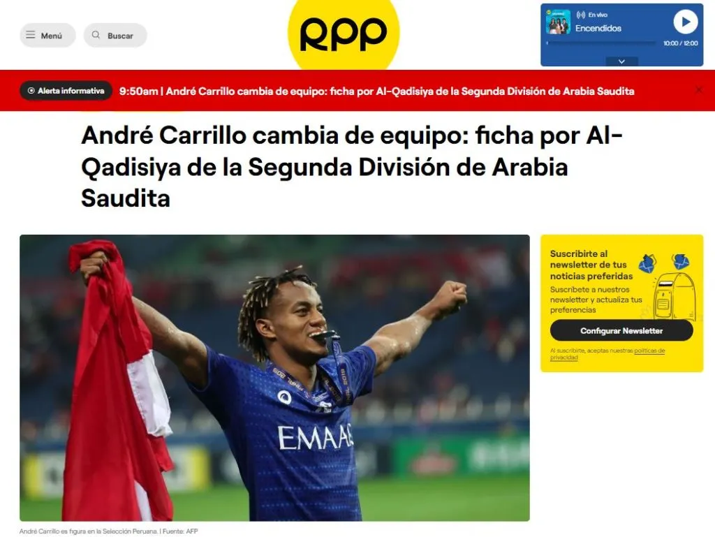 También, explica donde jugará el extremo de la Selección Peruana: “Cierra una etapa. André Carrillo no va más en el Al Hilal, club donde ganó una serie de títulos. Este miércoles, RPP pudo conocer que el delantero de la Selección Peruana llegó a un acuerdo con el Al-Qadisiya de la Segunda División de la liga de Arabia Saudita.