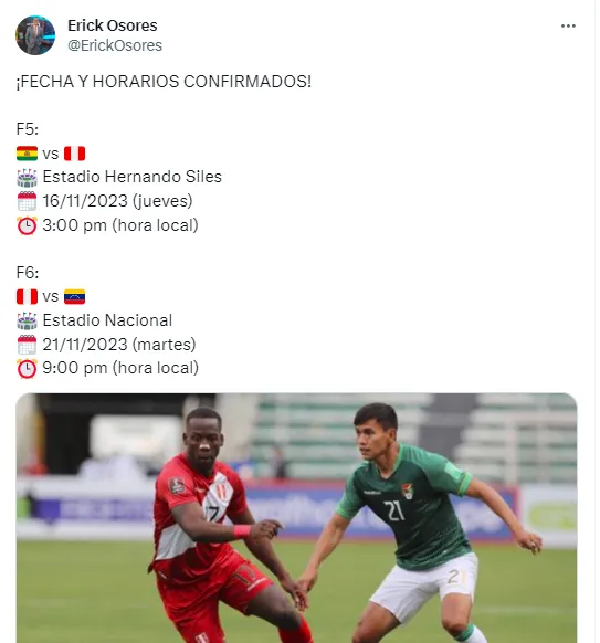 “¡FECHA Y HORARIOS CONFIRMADOS! F5: Bolivia vs Chile, Estadio Hernando Siles, 16/11/2023 (jueves), 3:00 pm (hora local). F6: Perú vs Venezuela, Estadio Nacional, 21/11/2023 (martes), 9:00 pm (hora local)”, explicó el comunicador en su cuenta oficial de X (antes llamado Twitter).