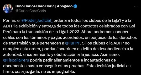 Dino Carlos Caro Coria, como asesor de la Federación Peruana de Fútbol, confirmó algo que seguramente no gustará para nada a los clubes opositores de este régimen: “Por fin, el Poder Judicial ordena a todos los clubes de la Liga 1 y a la ADFP la exhibición y entrega de todos los contratos celebrados con Gol Perú para la transmisión de la Liga 1-2023″”.