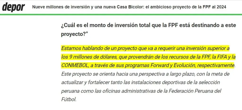 Durante la entrevista, el dirigente explicó que el monto llega gracias a la FPF, la FIFA y la CONMEBOL bajo el proyecto “Forward y Evolución”: “Estamos hablando de un proyecto que va a requerir una inversión superior a los 9 millones de dólares, que provendrán de los recursos de la FPF, la FIFA y la Conmebol”.