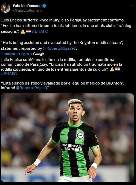 Fabrizio Romano en su cuenta de Twitter soltó la bomba al respecto: “Julio Enciso sufrió una lesión en la rodilla, también lo confirma comunicado de Paraguay: “Enciso ha sufrido un traumatismo en la rodilla izquierda, en uno de los entrenamientos de su club”. “Está siendo asistido y evaluado por el equipo médico de Brighton”, informó Roberto Rojas”.
