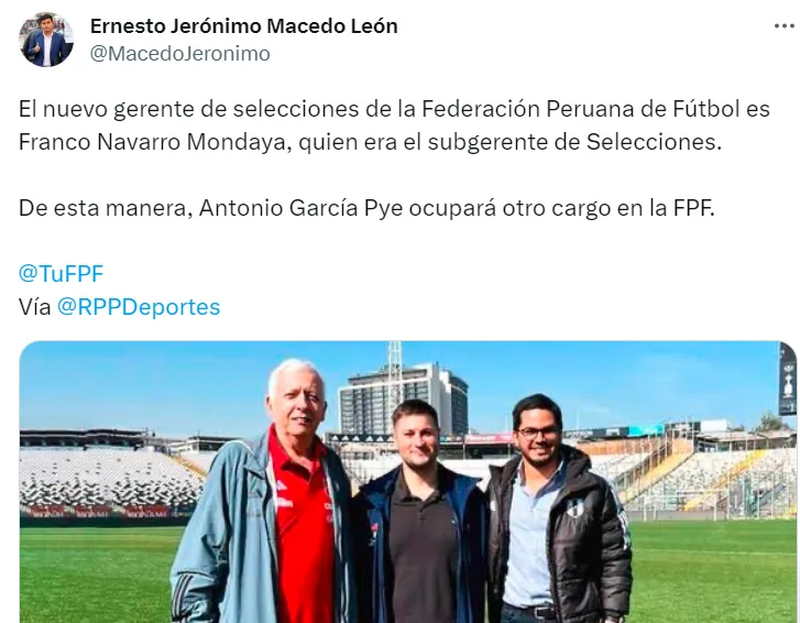 “El nuevo gerente de selecciones de la Federación Peruana de Fútbol es Franco Navarro Mondaya, quien era el subgerente de Selecciones. De esta manera, Antonio García Pye ocupará otro cargo en la FPF”, así lo anunció el periodista deportivo Jerónimo Macedo.