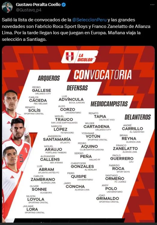 Presenta una premisa al respecto el periodista del Diario Líbero, Gustavo Peralta: “Salió la lista de convocados de la Selección Peruana y las grandes novedades son Fabricio Roca de Sport Boys y Franco Zanelatto de Alianza Lima. Por la tarde llegan los que juegan en Europa. Mañana viaja la selección a Santiago”.