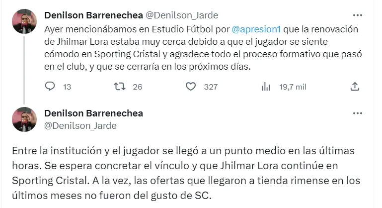 No cumpliendo las expectativas las de Independiente, Denilson Barrenechea dio la primicia en Estudio Fútbol: Lora renovará con Cristal por dos temporadas.